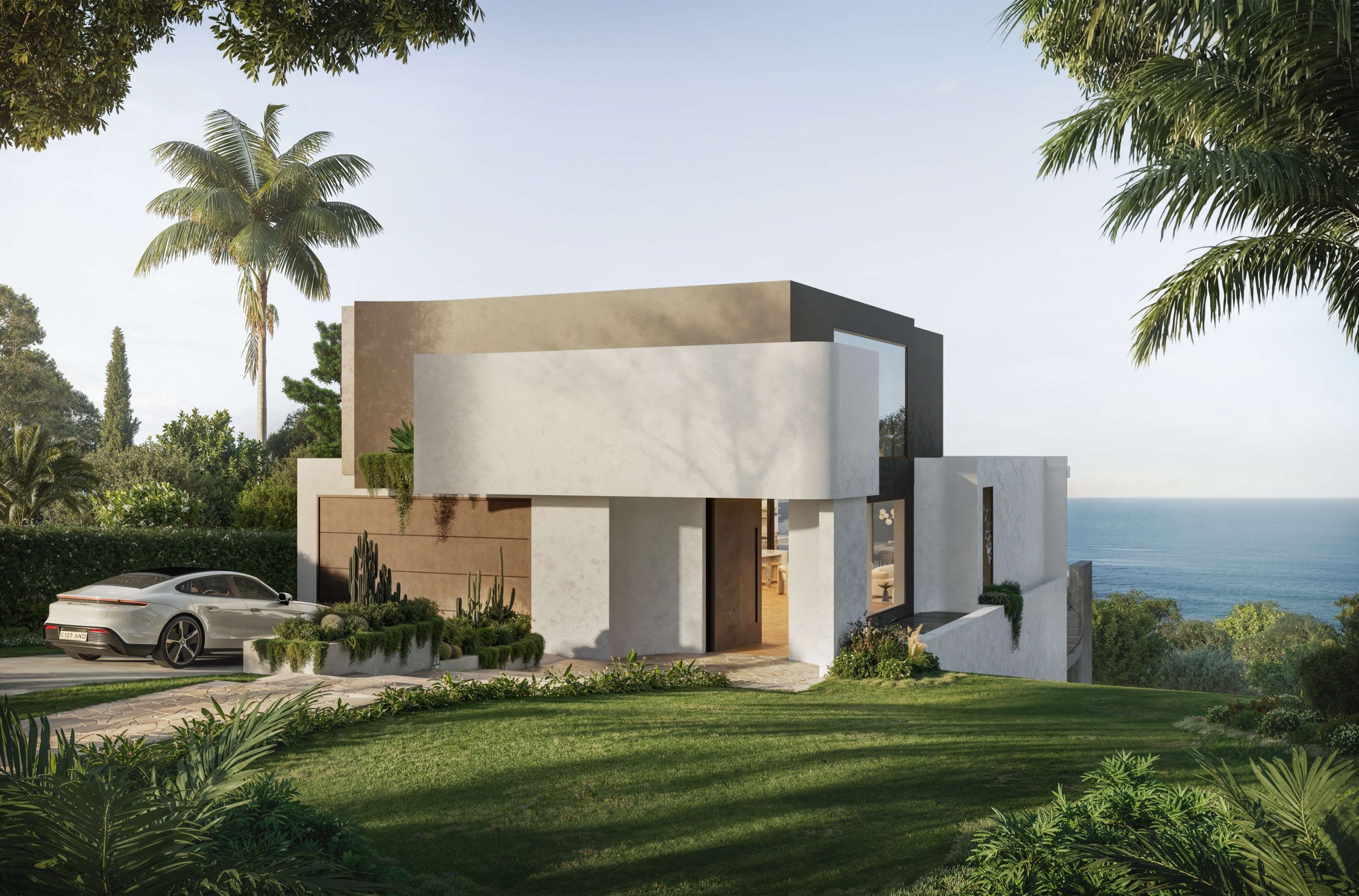 From the street, restrained. Clean volumes, natural stone, and a single pivoting entry. From the water, the full scale reveals itself — three storeys of architecture embedded into the headland, reading as landscape as much as building.